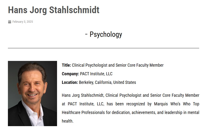 BERKELEY, CA, October 8, 2024 – Hans Jorg Stahlschmidt has been selected for inclusion in Marquis Who’s Who. As in all Marquis Who’s Who biographical volumes, individuals profiled are selected on the basis of current reference value. Factors such as position, noteworthy accomplishments, visibility, and prominence in a field are all taken into account during the selection process.
